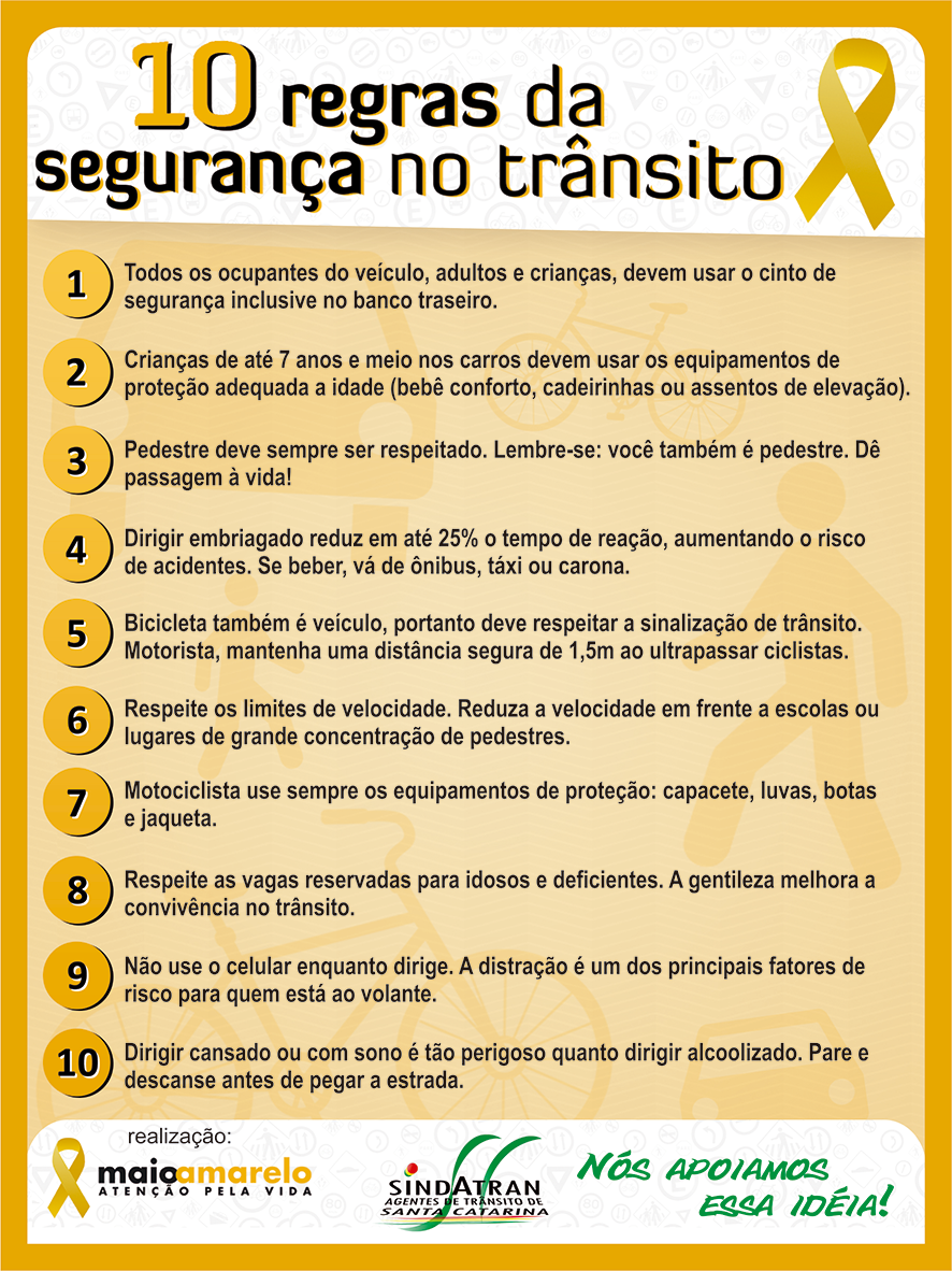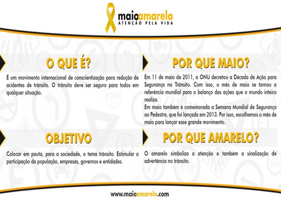 Até o início de 2015, será promovida uma série de ações sintonizadas com o movimento internacional “MAIO AMARELO” (www.maioamarelo.com), criado pela Organização das Nações Unidas (ONU) para mobilizar e conscientizar a sociedade sobre a importância da redução do número de mortes e feridos no trânsito.